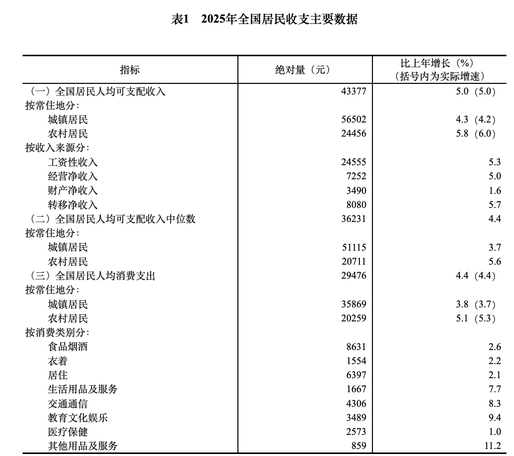 2025年,全国居民人均可支配收入43377元,比上年名义增长5.0%,扣除价格因素,实际增长5.0%。分城乡看,城镇居民人均可支配收入56502元,增长(以下如无特别说明,均为同比名义增长)4.3%,扣除价格因素,实际增长4.2%;农村居民人均可支配收入24456元,增长5.8%,扣除价格因素,实际增长6.0%。