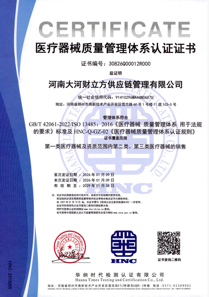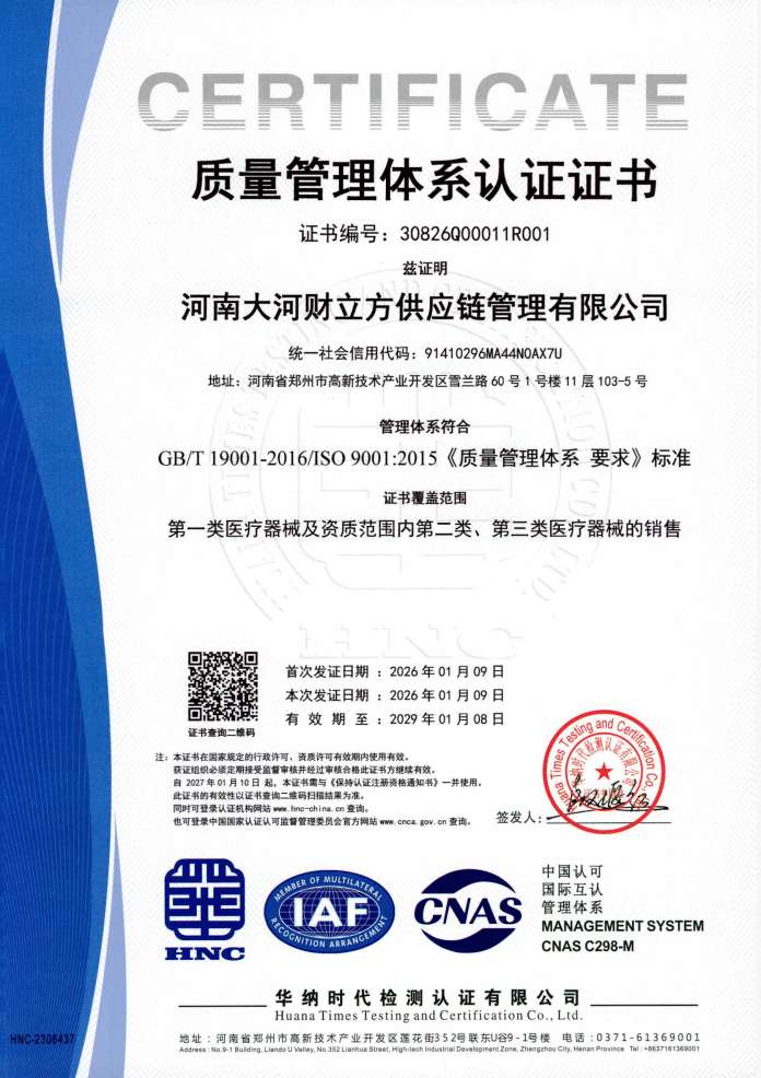 经过认证机构严格审核,财立方供应链公司获得质量管理体系认证证书(证书编号:30826Q00011R001)与医疗器械质量管理体系认证证书(证书编号:30826Q00012R000)。两项证书全面覆盖了第一类医疗器械及资质范围内第二类、第三类医疗器械的销售。