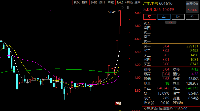 电力设备股继续保持强势,电网设备方向领涨,板块指数盘中一度放量飙升近7%,再创历史新高。汉缆股份、森源电气等多股开盘一字涨停,广电电气(601616)则在开盘后仅约1分钟垂直涨停,连续第2日封板,双杰电气、亿能电力等逾10股涨停或涨超10%。