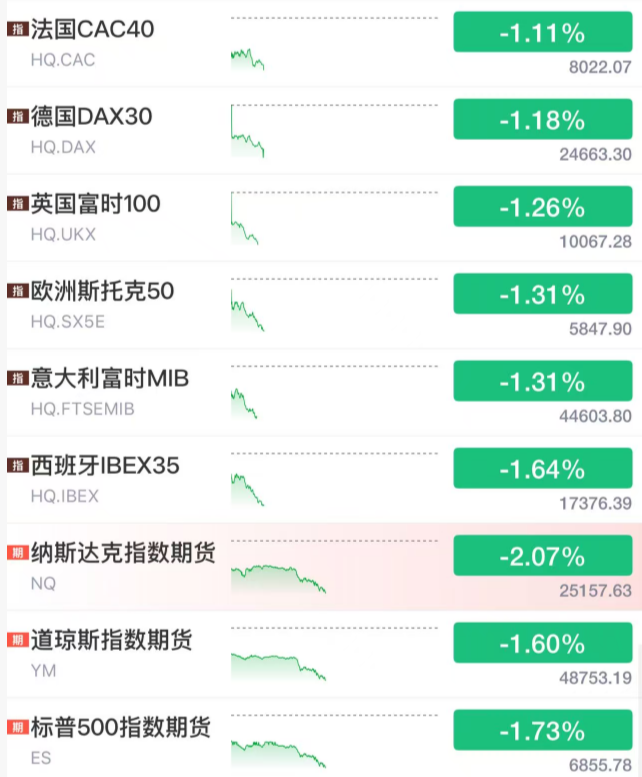 1月20日傍晚,随着美国与欧洲在“控制格陵兰岛”问题上的对峙没有任何缓和迹象,美股三大股指期货跌幅进一步扩大,道指期货暴跌约800点,纳斯达克指数期货暴跌2%,欧洲股市持续下跌。