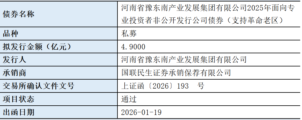 【大河财立方消息】1月20日消息,河南省豫东南产业发展集团有限公司2025年面向专业投资者非公开发行公司债券(支持革命老区)项目获上交所通过。本期债券拟发行金额4.9亿元,承销商为国联民生证券承销保荐有限公司。