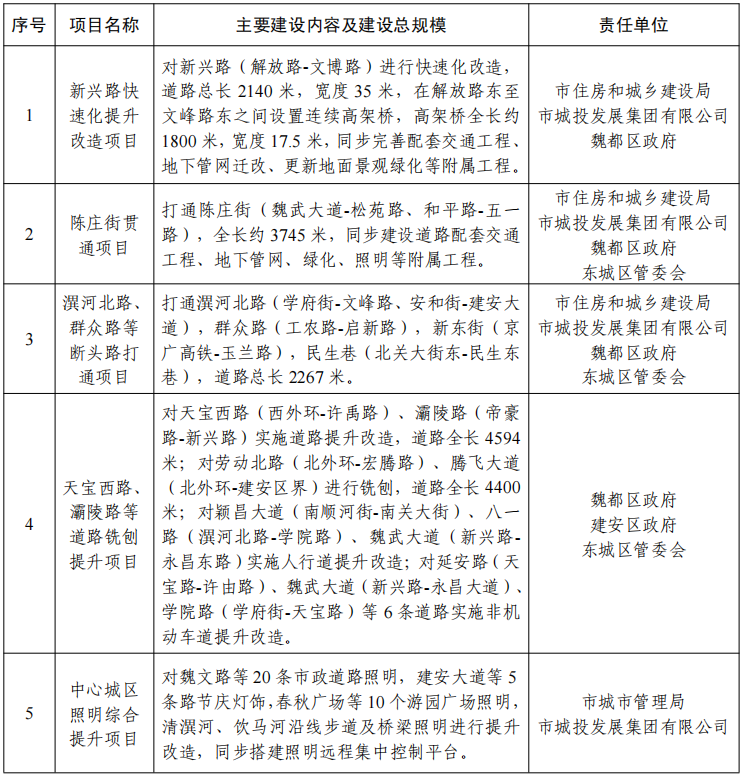 1.完善城市道路体系建设。加强城市道路建设,加快推进莲城大道、文峰路、天宝路、灞陵路等道路提升改造工程和人行道、非机动车道提升改造项目,谋划实施新兴路、文峰路等快速路建设工程,永兴路高速出入口建设工程,陈庄街贯通、新东街东延、潩河北路等断头路贯通工程,提升城市道路通行能力。(市住房和城乡建设局、市交通运输局、市城投发展集团有限公司按照职责分工负责)