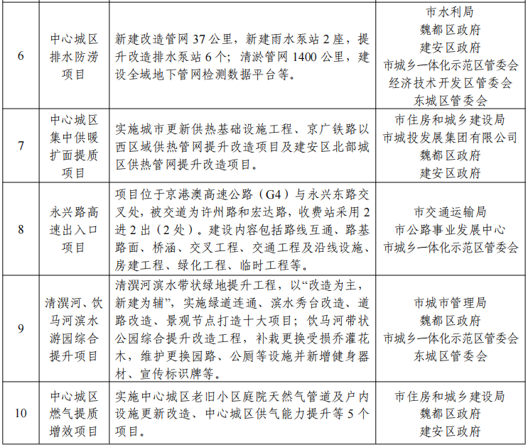 提升城市排水防涝能力。统筹城市防洪和内涝治理,对天宝河、饮马河、许扶运河、小洪河等城区主要排涝通道进行整治。
