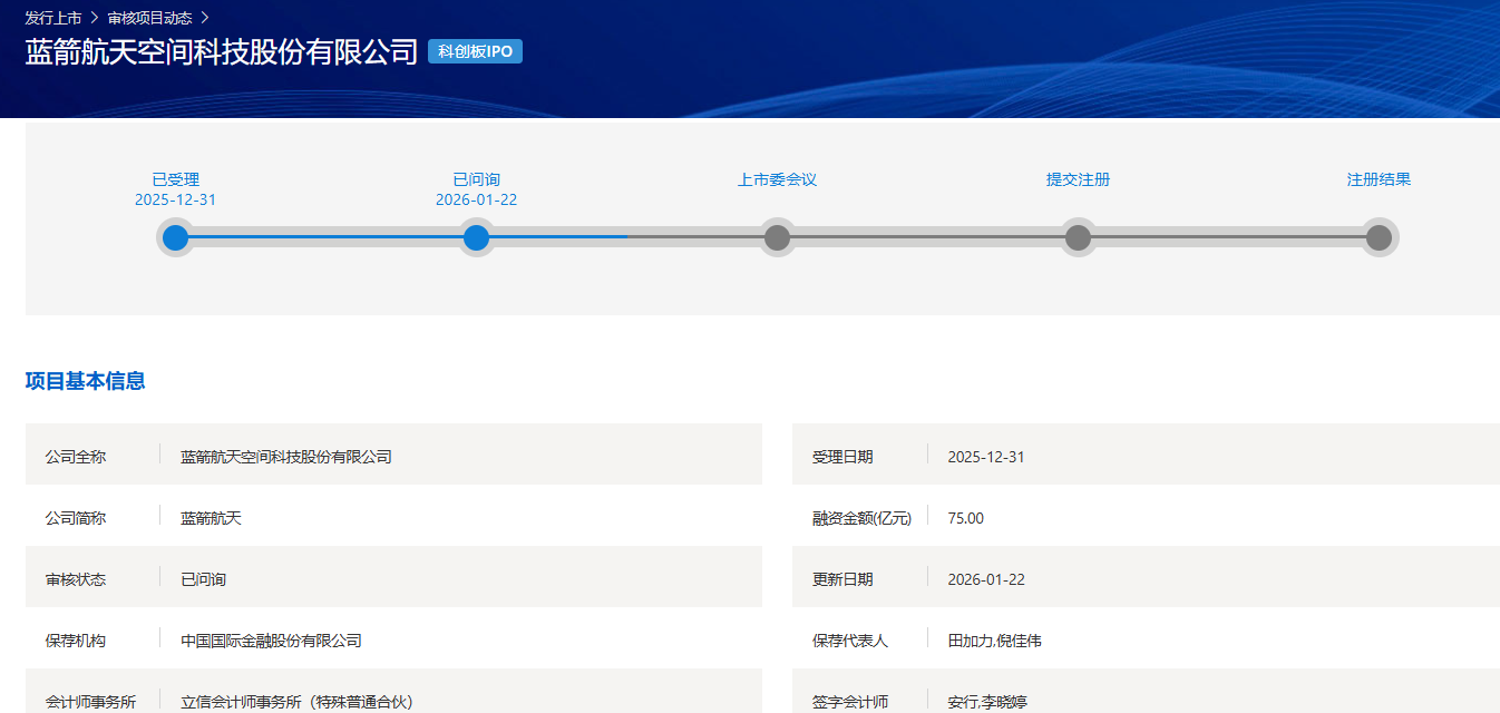 【大河财立方消息】1月22日,上交所官网显示,蓝箭航天空间科技股份有限公司(以下简称:蓝箭航天)科创板IPO审核状态变更为“已问询”。