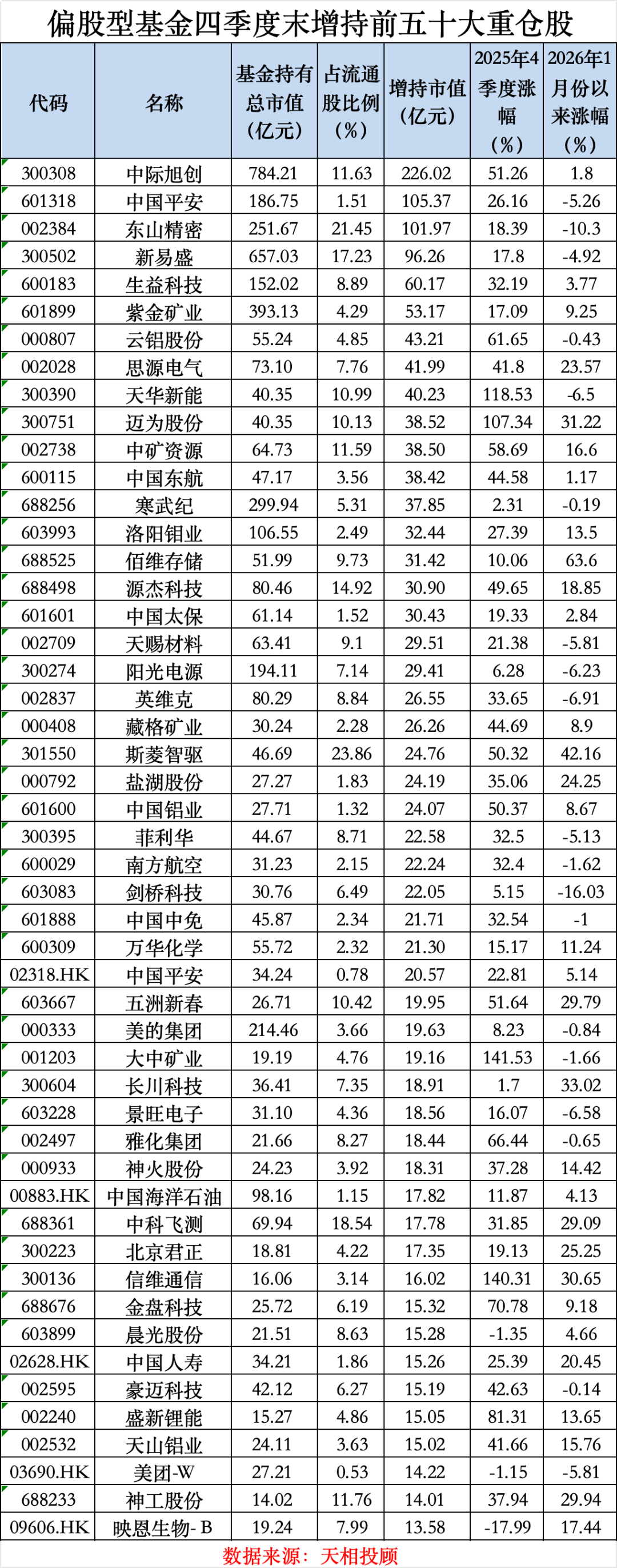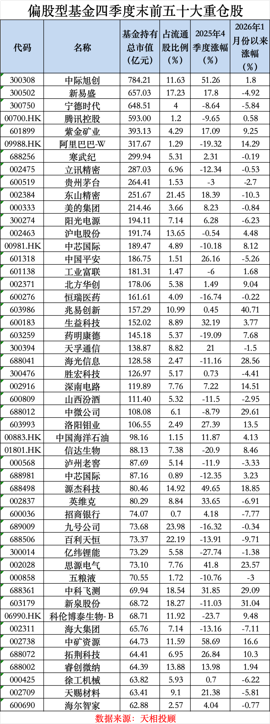 数据显示,截至去年四季度末,纳入统计的5458只积极投资偏股型基金的前十大重仓股分别为中际旭创、新易盛、宁德时代、腾讯控股、紫金矿业、阿里巴巴-W、寒武纪、立讯精密、贵州茅台、东山精密。