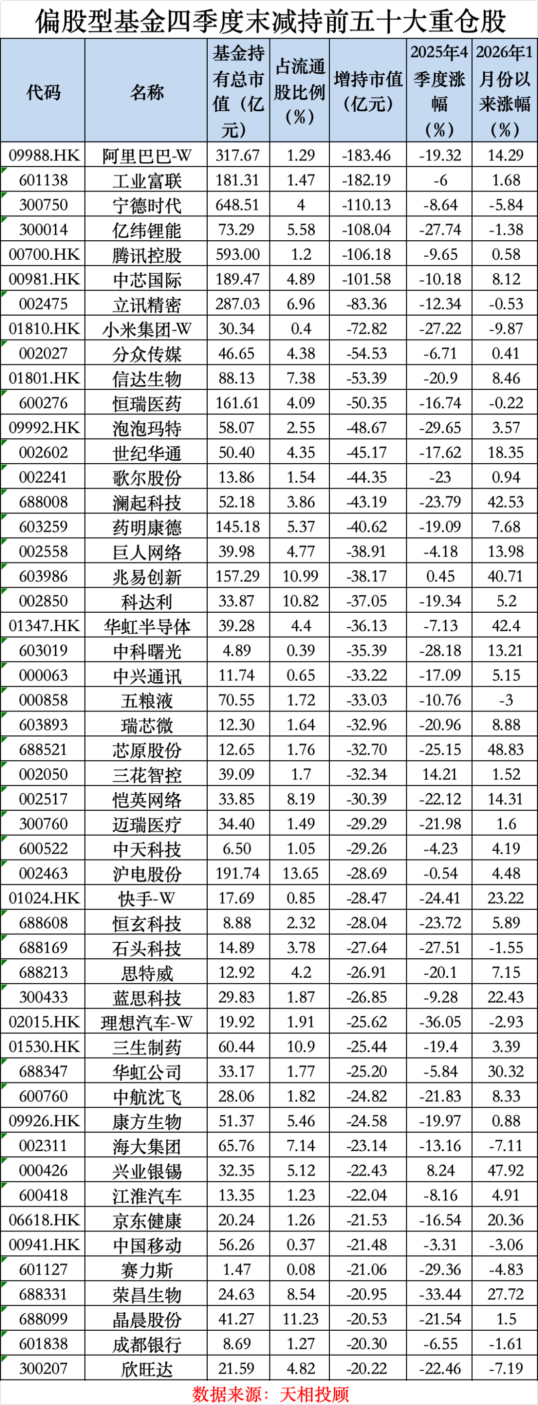 去年四季度,恒生科技指数表现疲软,不少权重股遭到偏股型基金减持。