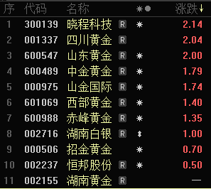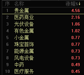 贵金属板块领涨A股,整体涨幅达4.56%,板块内个股全线飘红。