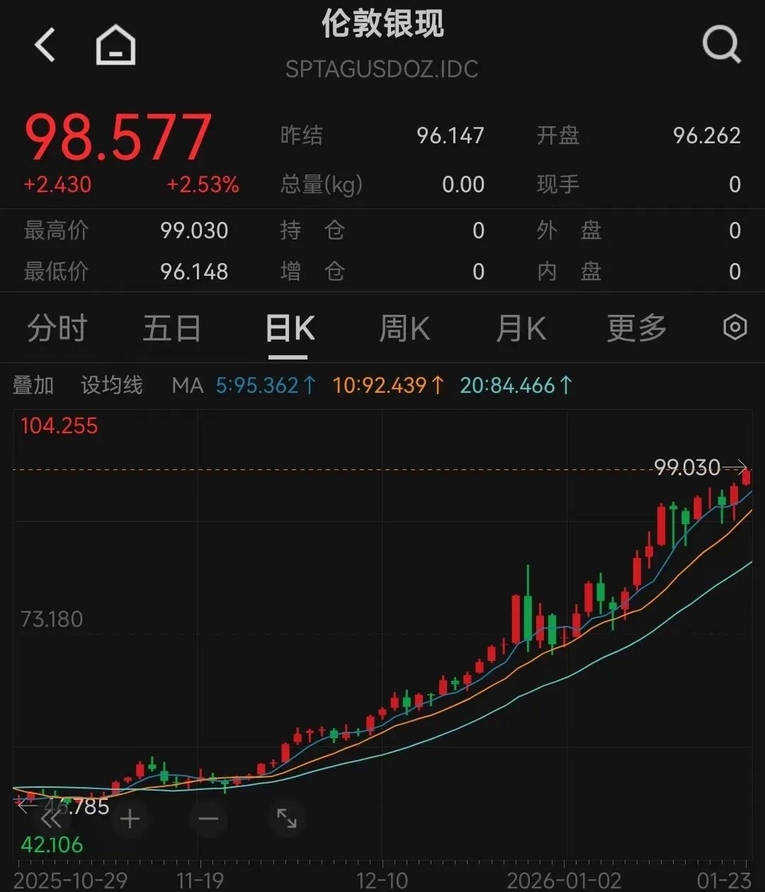 【大河财立方消息】1月23日,现货白银盘中涨幅扩大,最高上涨近3%,触及每盎司99.01美元的纪录高位。