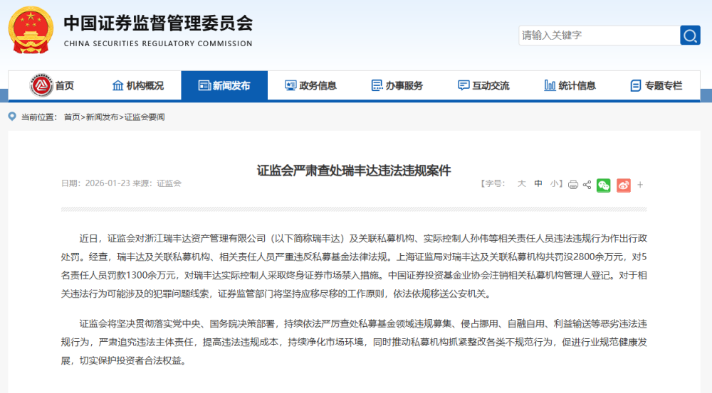 【大河财立方消息】近日,证监会对浙江瑞丰达资产管理有限公司(以下简称瑞丰达)及关联私募机构、实际控制人孙伟等相关责任人员违法违规行为作出行政处罚。