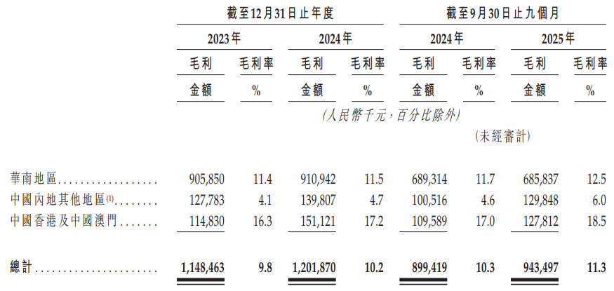 招股书显示,截至2025年前三季度,其在华南地区拥有2014家门店,占总门店数的68.6%,贡献了65.9%的营收。