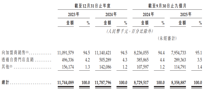 2023年至2025年前三季度,钱大妈向加盟商销售的收入占总营收比例均保持在94%以上,2025年前三季度达到95.1%,对加盟体系的依赖度颇为显著。