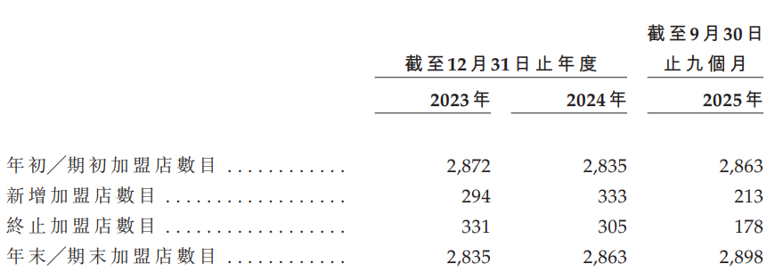 2023年初至2025年三季度末,其加盟店数量仅净增加26家,总数始终在2900家以下徘徊。