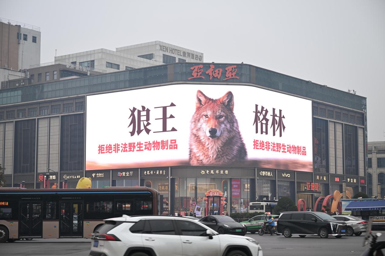 当这份跨越物种的感动刷屏全网,郑州“亚细亚之光”精准捕捉到了大众的情感共鸣与公益诉求。作为二七广场的核心地标,它联动这一热点,上线狼王格林主题公益海报,还截取《重返狼群》纪录片片段循环播放。