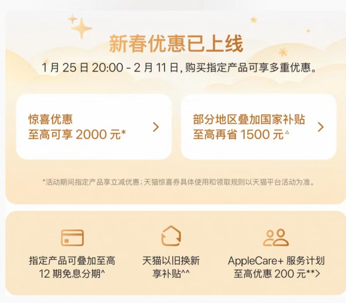 记者查询发现,本次促销活动从2026年1月25日晚上20:00起至2月11日凌晨23:59:59止,其中,原价7999元的256G的iPhone Air,官方立减2000元,叠加国补到手价5499元起。其他产品也有300到1200元不等的优惠。
