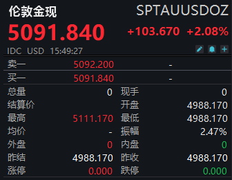 1月26日,国际金价继续走高,刷新历史纪录。伦敦金现历史首次突破5000美元/盎司后,再次突破5100美元/盎司,最高涨至5111.17美元/盎司。截至15:49,报5091.840美元/盎司,日内涨超2%。与年初相比,涨幅超过17%。