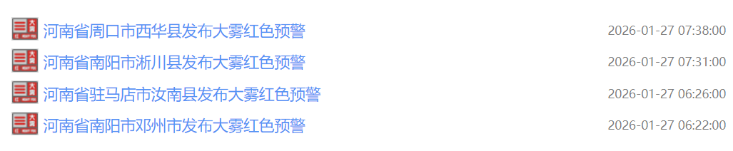 【大河财立方消息】1月27日,河南省周口市西华县、南阳市淅川县、南阳市邓州市、驻马店市汝南县等发布大雾红色预警。