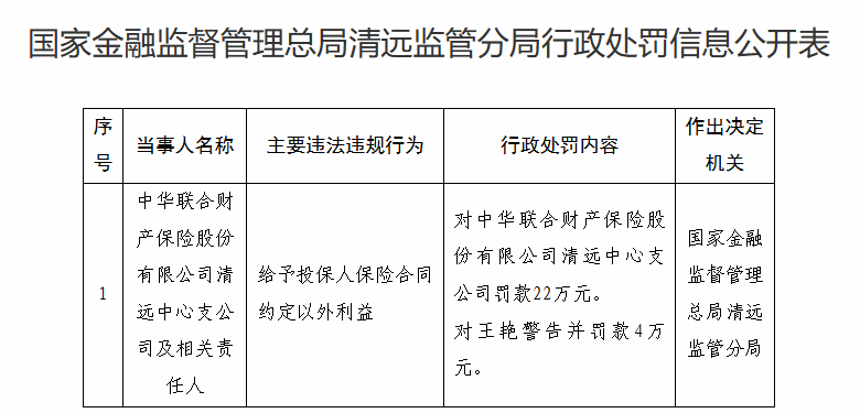 【大河财立方消息】1月26日,国家金融监督管理总局清远监管分局披露的行政处罚信息显示,因给予投保人保险合同约定以外利益,中华联合财产保险股份有限公司清远中心支公司被罚22万元,相关责任人王艳受到警告并处4万元罚款。