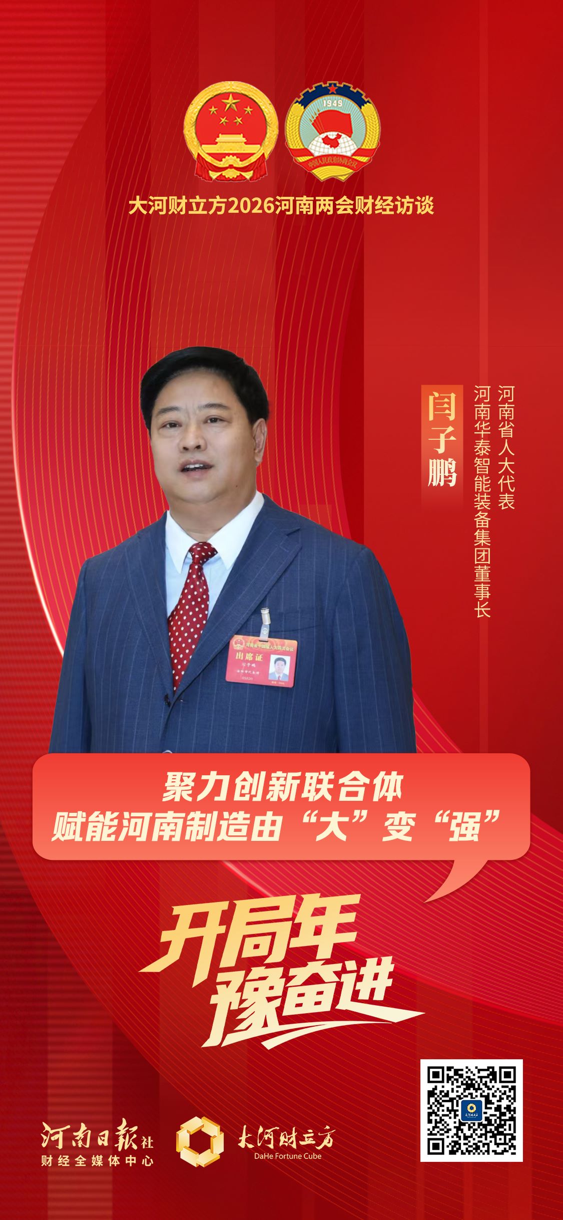 “作为人大代表和企业负责人,我将继续带领华泰集团坚守实业、深耕创新,同时积极履行代表职责,为我省制造业发展建言献策。只要我们坚定不移走科技创新之路,持续强化创新驱动,就一定能推动河南制造业从‘大’到‘强’的跨越,为中国式现代化建设河南实践构筑强大物质技术基础。”闫子鹏说。