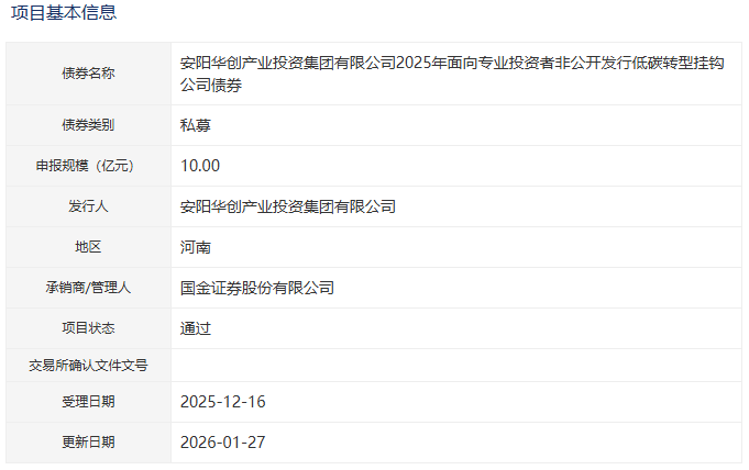 【大河财立方消息】1月28日消息,安阳华创产业投资集团有限公司2025年面向专业投资者非公开发行低碳转型挂钩公司债券项目获深交所通过。本次债券拟发行金额10亿元,承销商/管理人为国金证券。据悉,这是安阳华创产业投资集团首次发债。
