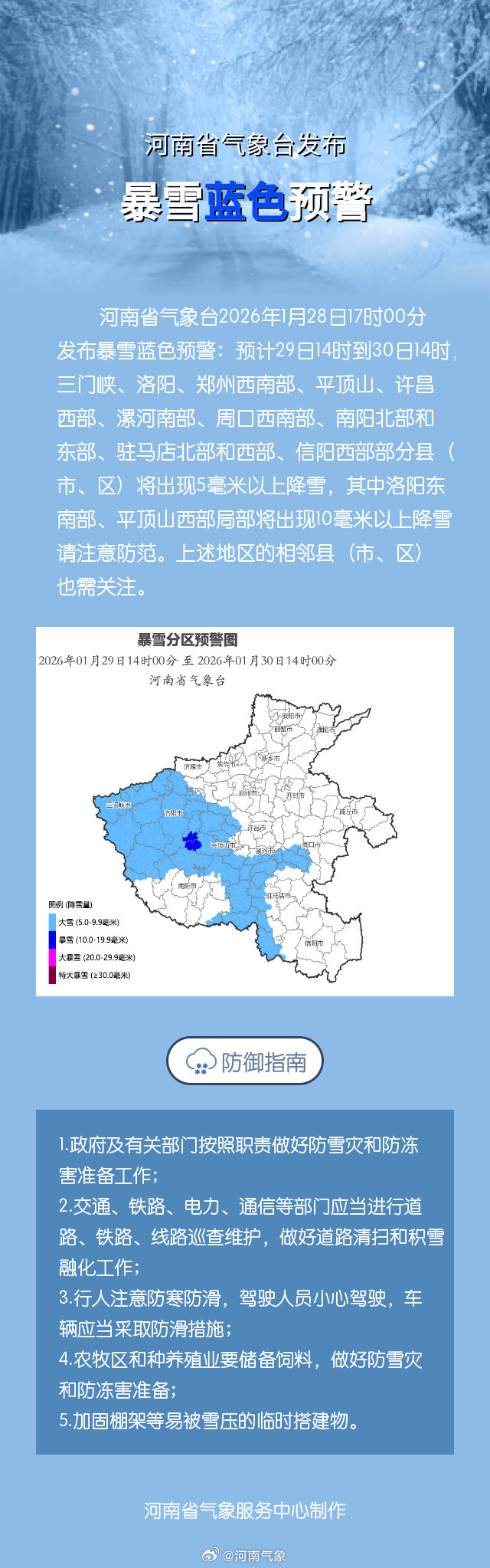 【大河财立方消息】河南省气象台2026年1月28日17时00分发布暴雪蓝色预警:预计29日14时到30日14时,三门峡、洛阳、郑州西南部、平顶山、许昌西部、漯河南部、周口西南部、南阳北部和东部、驻马店北部和西部、信阳西部部分县(市、区)将出现5毫米以上降雪,其中洛阳东南部、平顶山西部局部将出现10毫米以上降雪请注意防范。上述地区的相邻县(市、区)也需关注。