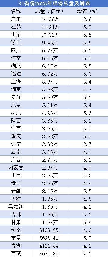 【大河财立方 记者 程帅星 岳炎霖】1月28日,随着江苏公布2025年经济数据,31个省(区、市)2025年经济“年报”全部出炉。其中,广东、江苏双双超过14万亿元,在总量上遥遥领先;增速方面,西藏以7%的速度领跑。在10个经济大省中,河南以5.6%的增速领先,以大体量实现高增速。