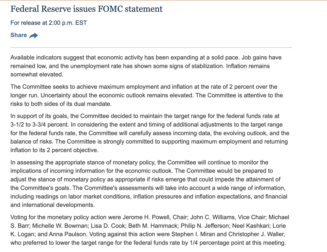 北京时间1月29日,美联储宣布将联邦基金利率目标区间维持在3.5%至3.75%之间不变,暂停了自去年9月以来的连续三次降息步伐,符合市场预期。