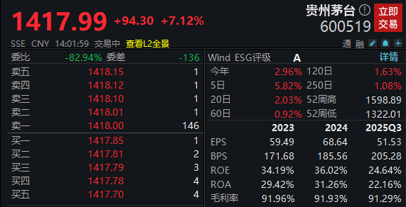 【大河财立方消息】1月29日,白酒板块午后持续走高,贵州茅台涨超7%,股价重回1400元。截至发稿,报1417.99元/股。