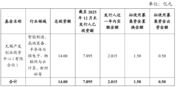 本期债券发行规模2亿元,利率2.05%,期限3年,募集资金中1.5亿元用于置换发行人一年内对无锡产发创业投资中心(有限合伙)出资,0.5亿元用于无锡产发创业投资中心(有限合伙)后续出资。2025年6月27日,经联合资信综合评定,发行人主体信用评级为AA。