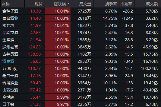 酒ETF(512690)盘中触及涨停。金种子酒、皇台酒业、水井坊、金徽酒、泸州老窖、古井贡酒、舍得酒业、酒鬼酒、五粮液、老白干酒、山西汾酒等批量涨停,白酒板块内其他个股均涨超8%。