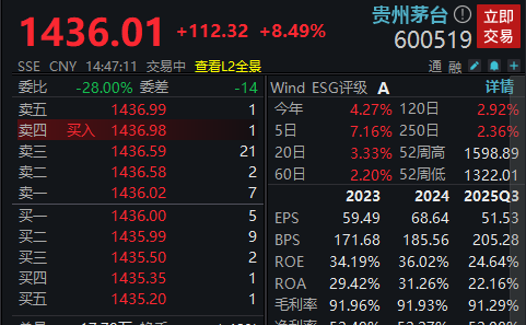 【大河财立方消息】1月29日,贵州茅台迎来久违反弹,盘中一度涨超9%,截至发稿涨幅8.49%。