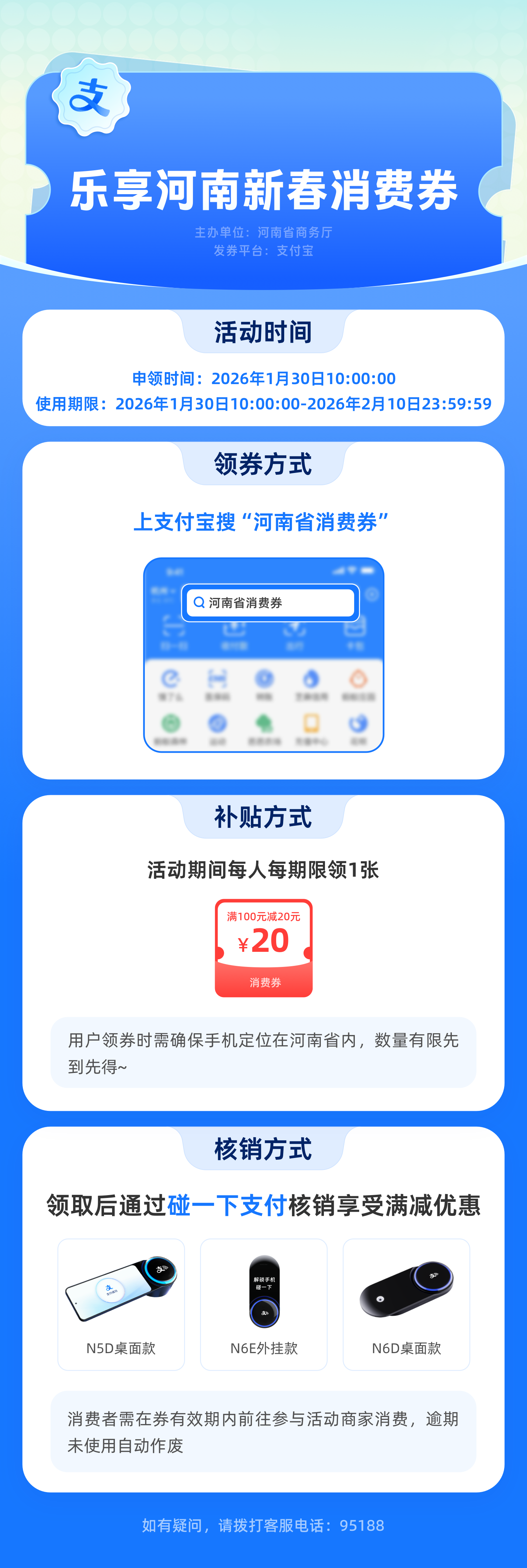 本次消费券面值为20元,消费满100元时使用,使用期限为1月30日至2月10日。所有在豫人员(包括外地来豫人员)可通过微信“乐享河南新春消费券”小程序和支付宝App领取,先到先得,领完为止。每人每期可从每个平台领取1张消费券。