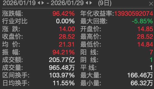 记者注意到,在1月19日~29日期间,招金黄金7次涨停,累计涨幅达96.42%。