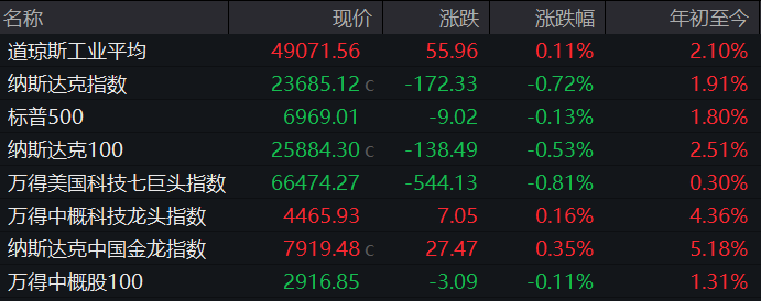 截至当天收盘,道指涨幅为0.11%;标普500指数跌幅为0.13%;纳指跌幅为0.72%。