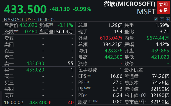 科技股涨跌互现,七巨头之一的微软暴跌9.99%,盘中最大跌超12%,成交547.92亿美元位居美股第一。