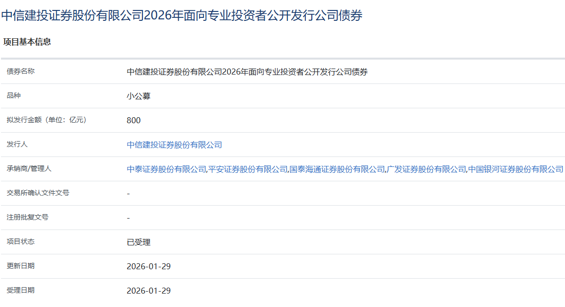 【大河财立方消息】1月29日,中信建投证券股份有限公司2026年面向专业投资者公开发行公司债券获上交所受理。该债券拟发行金额800亿元,品种为小公募。承销商/管理人为中泰证券、平安证券、国泰海通证券、广发证券和中国银河证券。