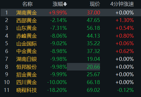 【大河财立方消息】1月30日,A股贵金属板块大幅回调,多只黄金股大跌。其中,四川黄金、招金黄金、湖南白银等跌停,晓程科技大跌超18%,西部黄金、山东黄金、赤峰黄金等跟跌;湖南黄金逆势涨停,录得5连板。