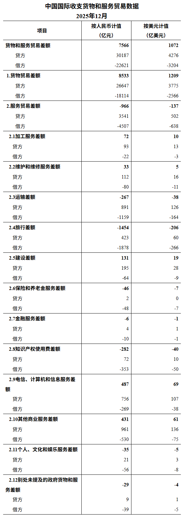 按美元计值,2025年12月,我国国际收支货物和服务贸易出口4276亿美元,进口3204亿美元,顺差1072亿美元。