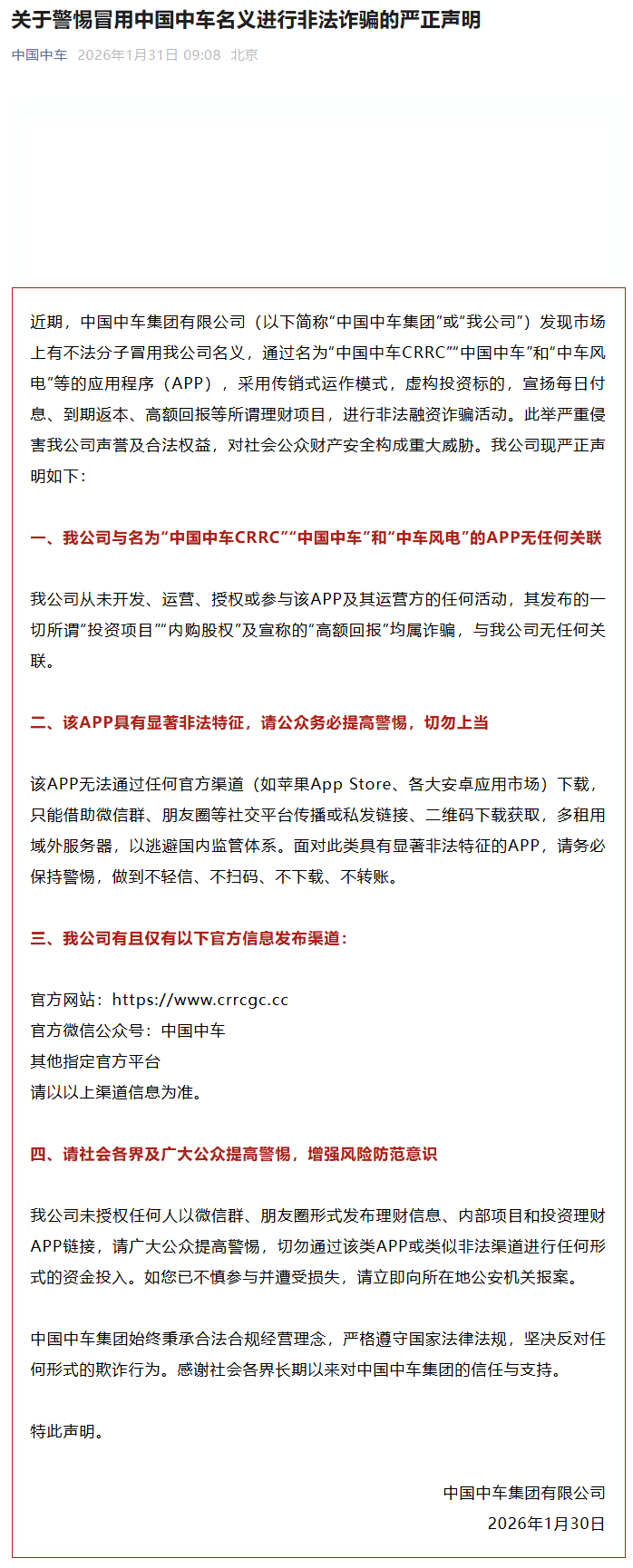 【大河财立方消息】1月31日,中国中车集团有限公司发布关于警惕冒用中国中车名义进行非法诈骗的严正声明。