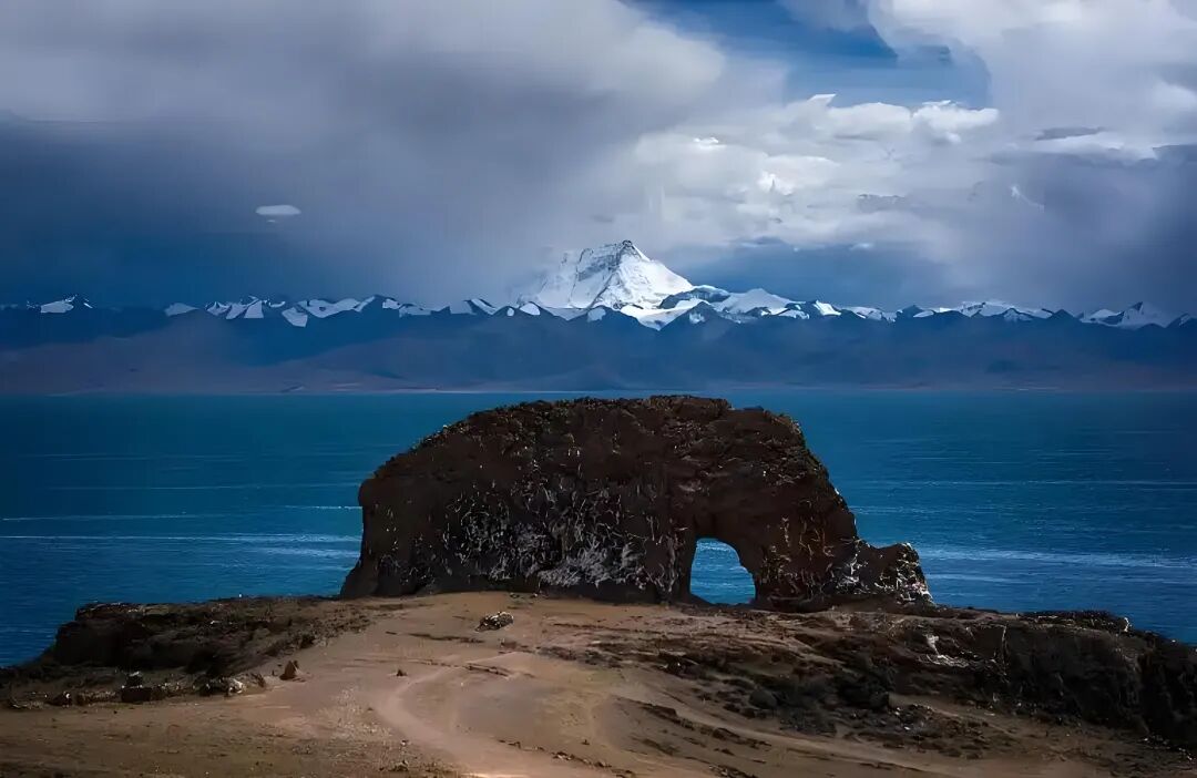 眼前的一幕,让我瞬间忘记了所有的湿冷与颠簸。那巨大的天然石拱门,仿佛一头巨象,正伸长鼻子在饮用纳木措的圣水。石象的造型浑然天成,历经千万年风霜雨雪的雕琢,透着一种永恒的庄严与宁静。透过那扇“天门”望出去,是雨后更加澄澈碧蓝的纳木措湖水和依旧带着些许水汽的、轮廓柔和的念青唐古拉雪山。