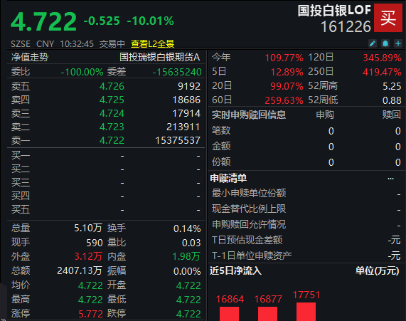 1月29日国投白银LOF连续第二天涨停,溢价率达64%。1月30日,国投白银LOF全天停牌。