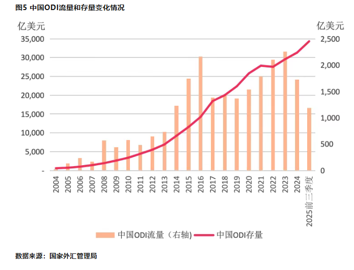 我国对外直接投资(ODI)起步于20世纪80年代,于1984年首次突破1亿美元,1992年迎来第一波快速增长的浪潮,2001年“入世”为我国ODI再一次注入动力。但彼时我国尚处于融入全球价值链初期,境内企业“走出去”后竞争力相对较弱,ODI年均投资规模低于200亿美元,在全球占比仅为1%。2008—2014年,随着国内制造业竞争实力的逐步提升,企业“走出去”经验不断积累,我国开始深度参与全球价值链,ODI流量年均增速加快,规模逐步升至1000亿美元,在全球占比升至8%以上。2015年以来,我国经济结构调整和制造业转型升级加快推进,企业“走出去”参与全球产业链供应链程度不断加深,ODI流量持续稳健增长,2023年达到历史峰值2257亿美元。2024年我国ODI流量1722亿美元,占全球ODI流量份额(根据国际货币基金组织公布的国际收支口径ODI流量计算)的10%左右,排名第4,剔除卢森堡后仅次于美国和日本。截至2025年9月末,我国ODI存量达3.43万亿美元,占到我国对外非储备金融资产的44%。