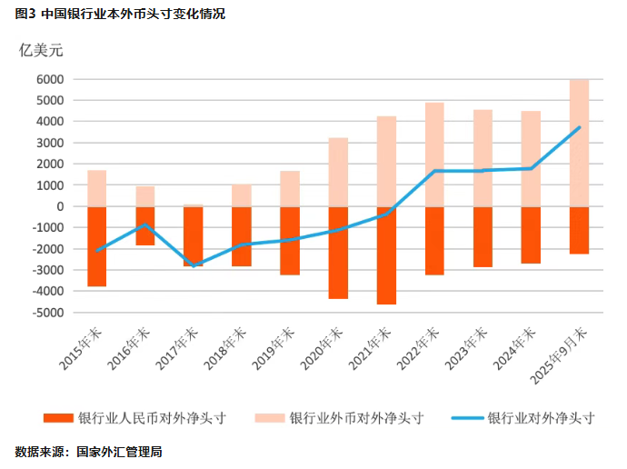 分币种看,本币对外净负债减少、外币对外净资产增加驱动我国银行业对外净头寸变动,其中外币净头寸变化是主要原因。银行业人民币对外头寸持续为净负债,反映了人民币国际化初期,本币作为投资货币的重要特征。到2025年9月末,银行业人民币净负债2249亿美元,较2015年末减少1535亿美元,贡献了同期银行业对外净负债降幅的26.4%。外币对外头寸持续为净资产,至2025年9月末达5965亿美元,较2015年末增加4277亿美元,贡献了同期银行业对外净负债降幅的73.6%,反映在经常项目长期顺差背景下,银行业是对外外币资金运用的主力。不过,如果银行吸收境内外汇存款,用于对外外币资金运作,虽然名义上是银行部门的对外资产运用,但实际外汇资产的所有权仍是境内非银行部门。