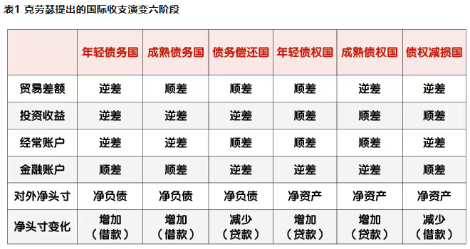19世纪70年代,凯尔恩斯通过英国的经验发现了经济增长与国际收支之间的关联,并得出一国的国际收支在经济发展过程中一般会朝不同阶段演变的结论。1948年,萨缪尔森基于对一些发达国家的案例研究,确认并丰富了凯尔恩斯的观点,提出国际收支的四阶段假说,即一国随着其收入的持续增长,将依次经历年轻的成长型债务国、成熟债务国、新兴债权国和成熟债权国四个阶段。1957年,克劳瑟进一步将这四个阶段扩展为六个:年轻债务国、成熟债务国、债务偿还国、年轻债权国、成熟债权国和债权减损国。