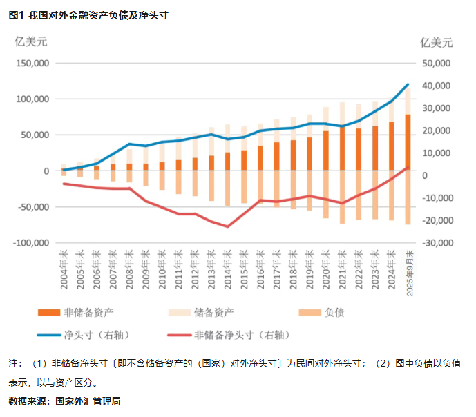 改革开放特别是加入世界贸易组织(WTO)以来,我国涉外经济蓬勃发展,对外金融资产负债头寸快速增长,规模位居全球前列。据国家外汇管理局公布的数据,截至2025年9月末,我国对外金融资产11.51万亿美元,较2004年末增长11.29倍;对外负债7.46万亿美元,增长9.73倍;对外净资产4.05万亿美元,增长15.81倍。同时,我国对外金融资产负债结构持续动态优化:民间对外头寸逐步转正,“藏汇于民”成果显著;非金融企业对外头寸比重提升,资产主体逐步多元化;“走出去”与“引进来”并重,我国逐步从利用外资大国迈向对外投资大国;跨境证券投资日趋活跃,证券投资资产负债在我国总对外金融资产负债中比重逐步向发达国家靠拢。笔者分析了我国国际投资头寸(即对外金融资产负债)状况演变过程中呈现的四个特征,并对未来进一步扩大金融双向开放提出政策建议。