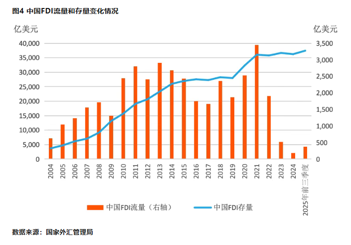 我国吸收外商直接投资(FDI)相对其他类型投资起步早、比重大。国际收支平衡表的流量数据(下同)显示,早在20世纪70年代,我国就有少量的FDI流入。到1981年,FDI首次破2亿美元,随后一直保持净流入且规模震荡上行。2021年,FDI净流入达到历史最高3441亿美元。2022年以来,随着美国等主要经济体开始加息进程,在境外融资成本上升、境内融资成本优势凸显的情况下,境内偿还境外关联公司贷款的同时,也向境外关联公司提供贷款,与股权投资一并推动FDI净流入下降,2024年跌至净流入186亿美元。国际投资头寸表的存量数据显示,2004年有数据以来,FDI负债就一直是我国最主要的对外负债,占比在50%左右波动。截至2025年9月末,我国FDI存量3.74万亿美元,占比50.2%。