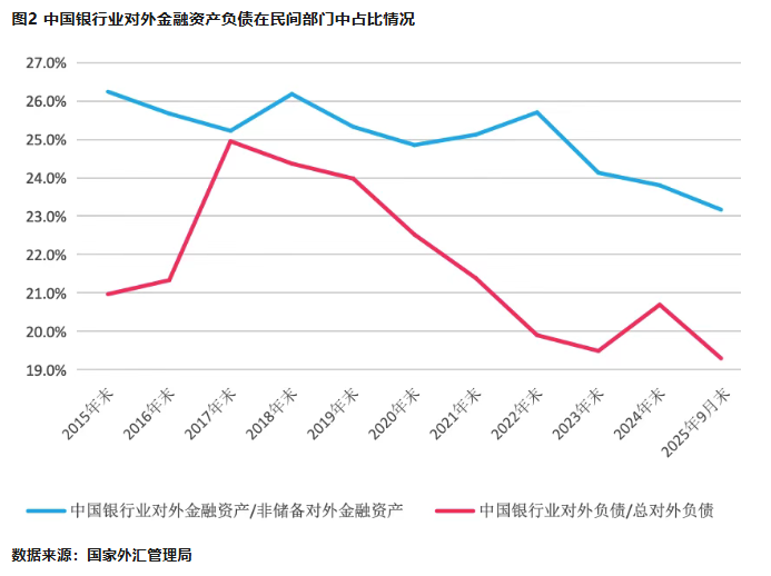 银行业在我国民间整体对外金融资产负债中占比呈现先高后低的趋势。2015年末,我国银行业对外金融资产7392亿美元,在民间对外金融资产(即不含储备的对外金融资产)中占比26.2%;至2025年9月末,银行业对外金融资产达到1.81万亿美元,在民间对外金融资产中占比降至23.2%。2015年末,银行业对外负债9488亿美元,在对外负债中占比21.0%,在2017年最高达到25.0%,后逐步回落;至2025年9月末,银行业对外负债达到1.44万亿美元,占比下降至19.3%。我国金融开放遵循了“先流入后流出”的国际惯例,这也解释了银行业在民间对外金融资产中占比下降更多的情况。