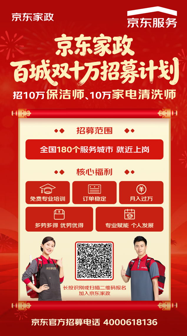 为保障春节期间千万家庭的洁净需求,同时助力家政行业职业化人才培养,京东家政正式启动“百城双十万招募计划”,将在全国180座服务城市招募10万名保洁师、10万名家电清洗师。通过免费开放的全链条专业培训体系,助力从业者快速持证上岗,培养高质量家政人才。