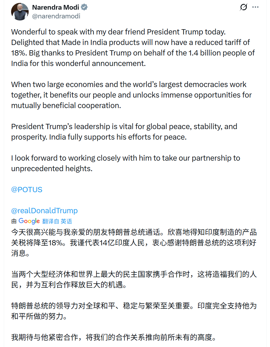莫迪也在社交媒体发文确认该协议,称“‘印度制造’产品的关税现已下调至18%”。
