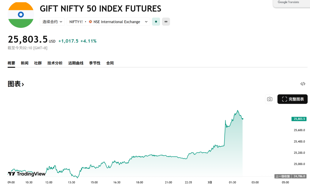 受消息影响,印度基准股指Nifty 50的股指期货一度飙升;在美国上市的iShares MSCI India ETF涨近3%。离岸市场中,印度卢比对美元走强,上涨1%。