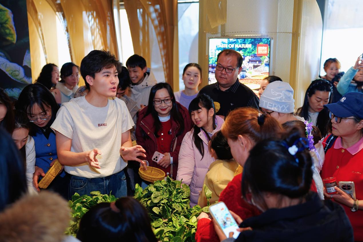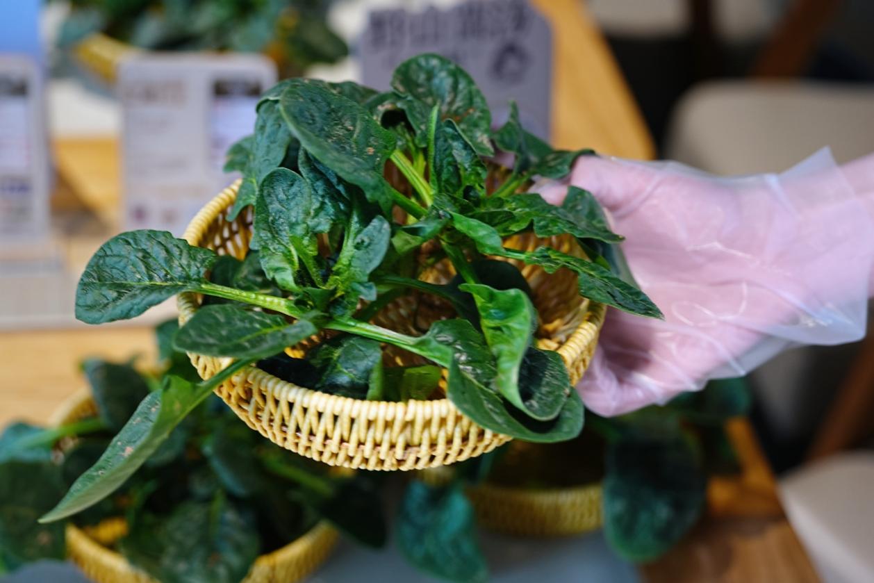 品鉴会现场,暖意与鲜香交织,顾客们的参与热情高涨。在互动区,新鲜采摘的笨菠菜整齐陈列,叶茎沾着泥土,带着刚从田间收割的湿润气息。